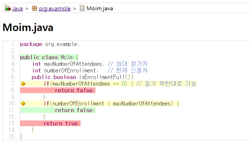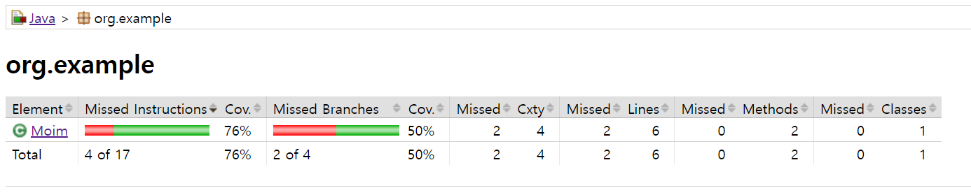 즉, 분기 조건의 절반만 테스트된 상태이다. - 빨간색: 해당 코드 또는 분기가 전혀 테스트되지 않았음을 의미한다.