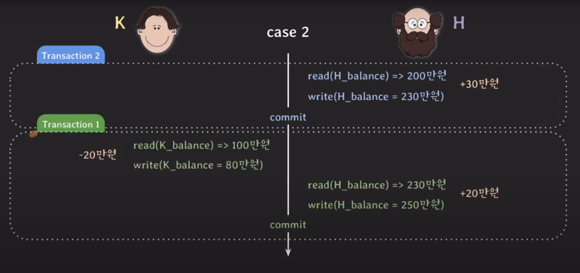 트랜잭션1 K가 H에게 20만원 입금
