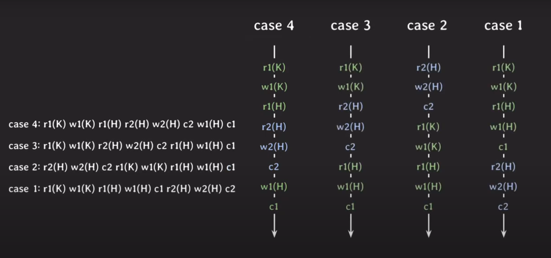 반면 CASE4는 어떤 serial schedule 과도 conflict equivalent 하지 않아서 정상적인 결과가 나오지 않는다.