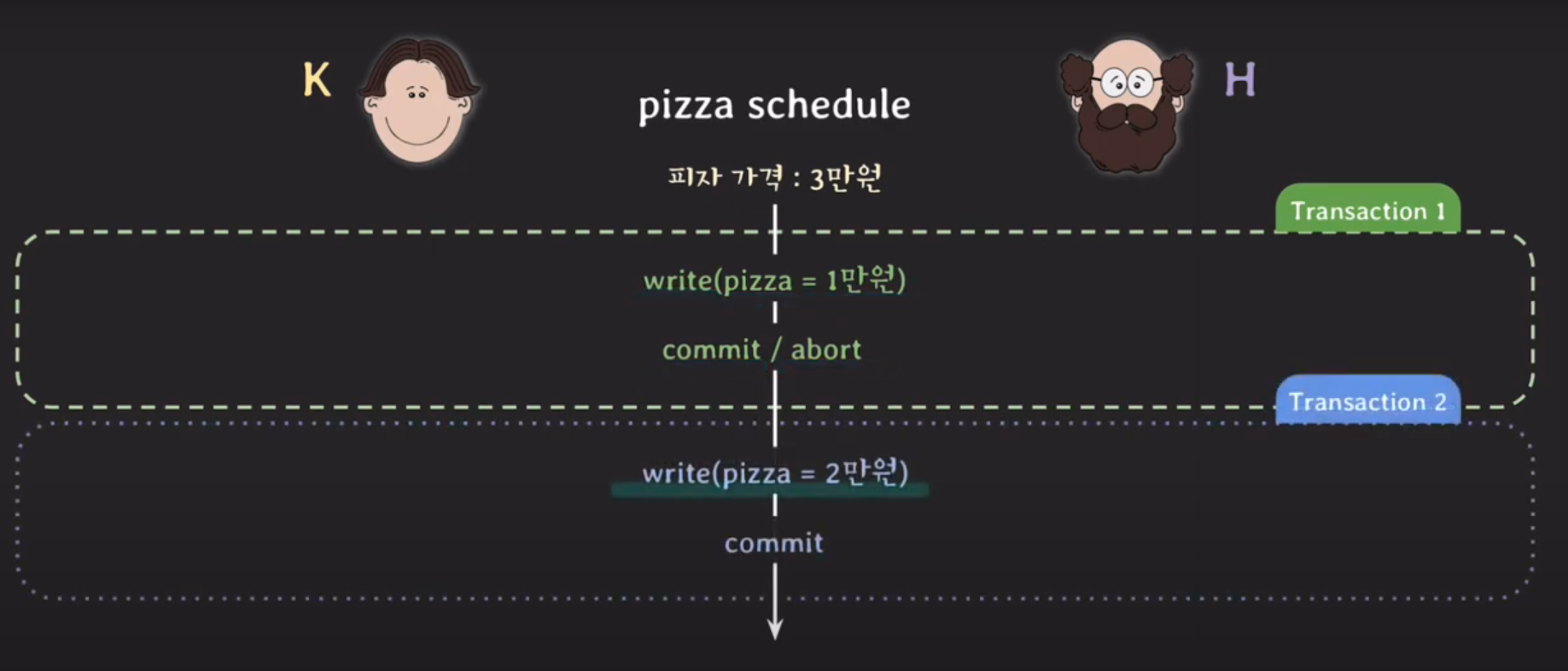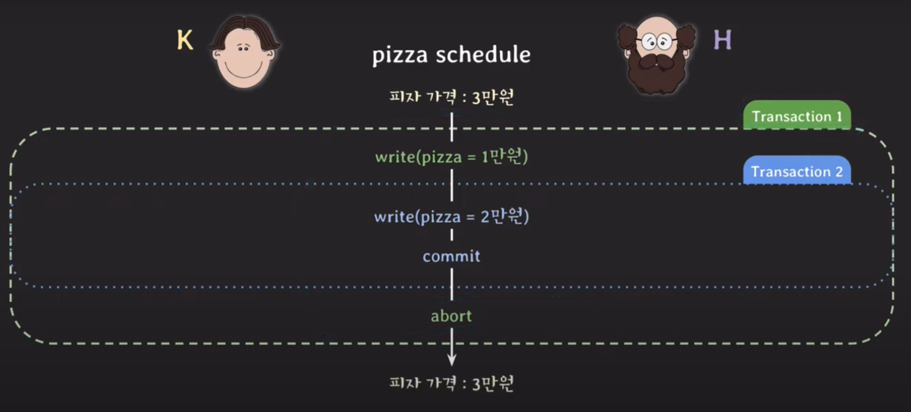 피자 가격이 최종적으로 3만원이 되었다. 즉 트랜잭션2의 작업이 날라갔다.