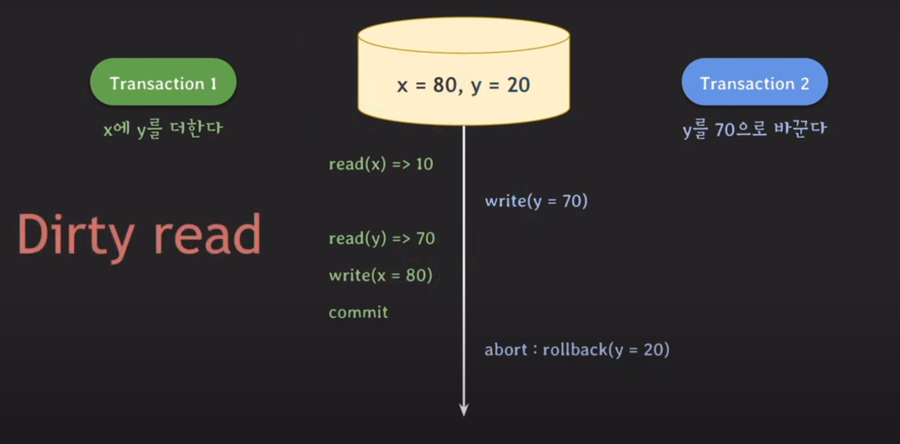 이때 트랜잭션2에서 커밋 되지 않은 x에 대한 값을 읽는다. 그리고 y 또한 읽는다