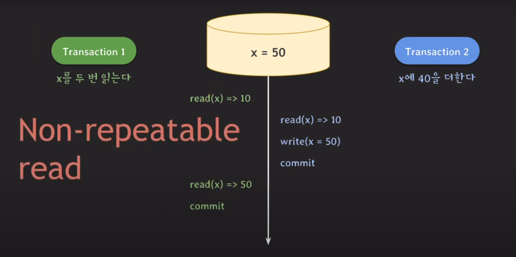 트랜잭션1의 첫 번째 read 10 지만 중간에 트랜잭션2가 x를 50으로 바꾸고 커밋해서