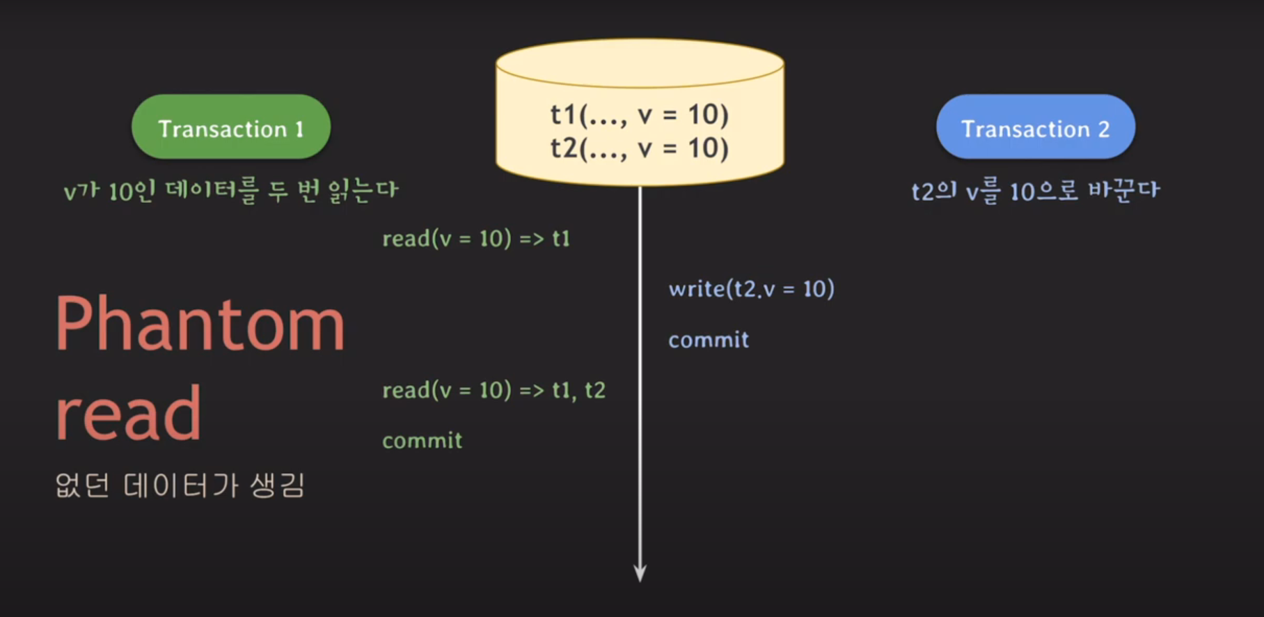 이후에 트랜잭션2가 t2의 v를 10으로 바꿔서 트랜잭션1이 다시 v = 10인 튜플을 찾았을 때 t1, t2 없던 데이터가 생겼다.