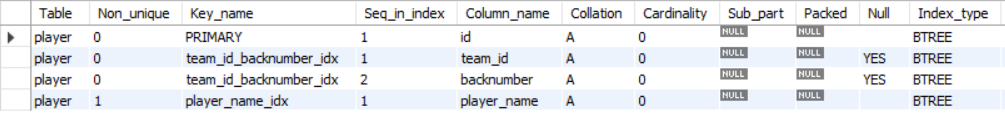 SHOW INDEX FROM player;