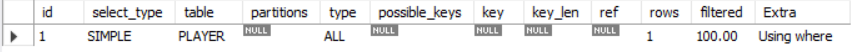 EXPLAIN SELECT * FROM PLAYER WHERE BACKNUMBER = 7;