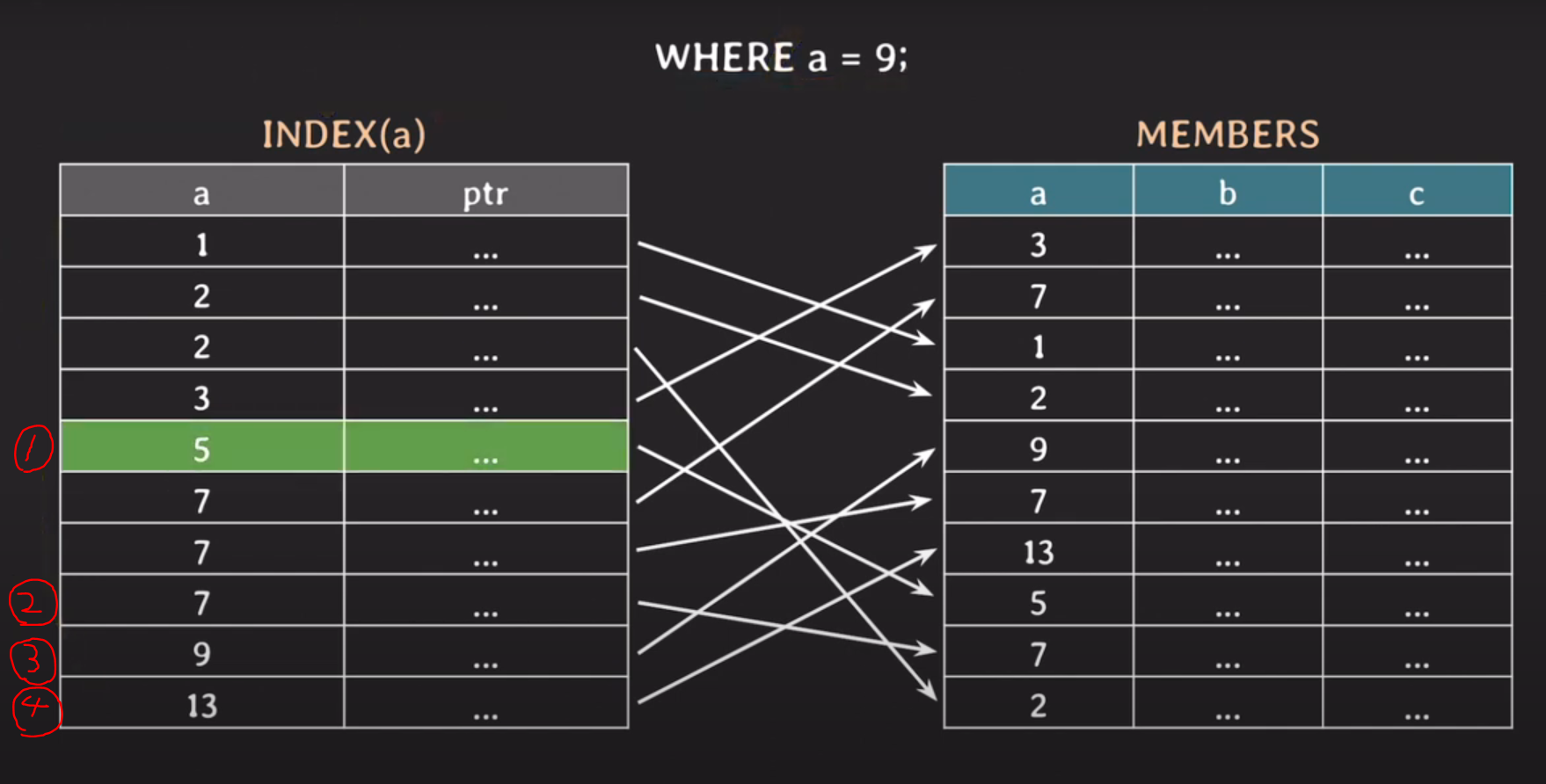 WHERE 절에 걸린 9는 현재 인덱스의 9와 동일하다.