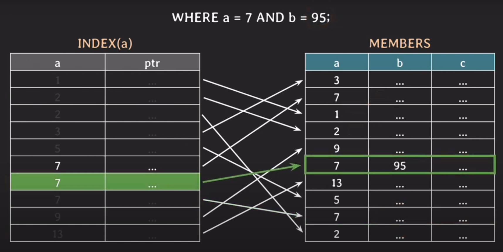 WHERE a = 7 AND B = 95;
