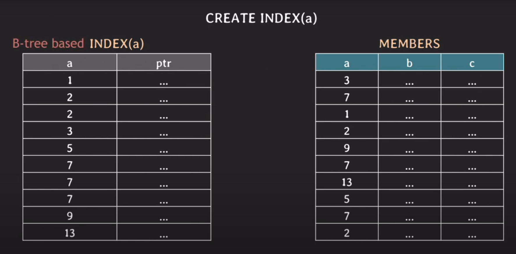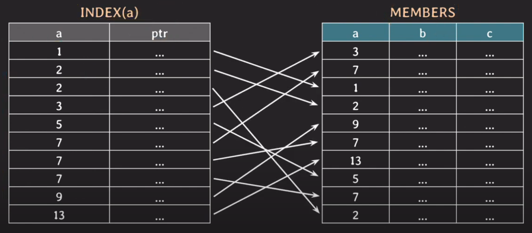 INDEX(a)는 a에 대한 값을 정렬된 순서로 저장된다.