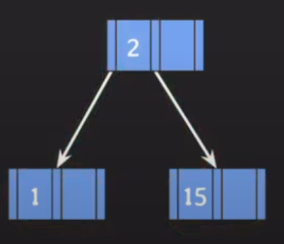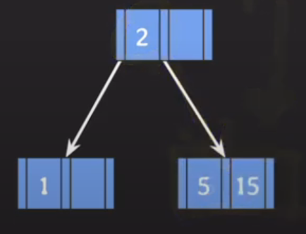 그래서 가운데 key를 기준으로 (1, 15)분할하고 가운데 key 2는 승진한다.