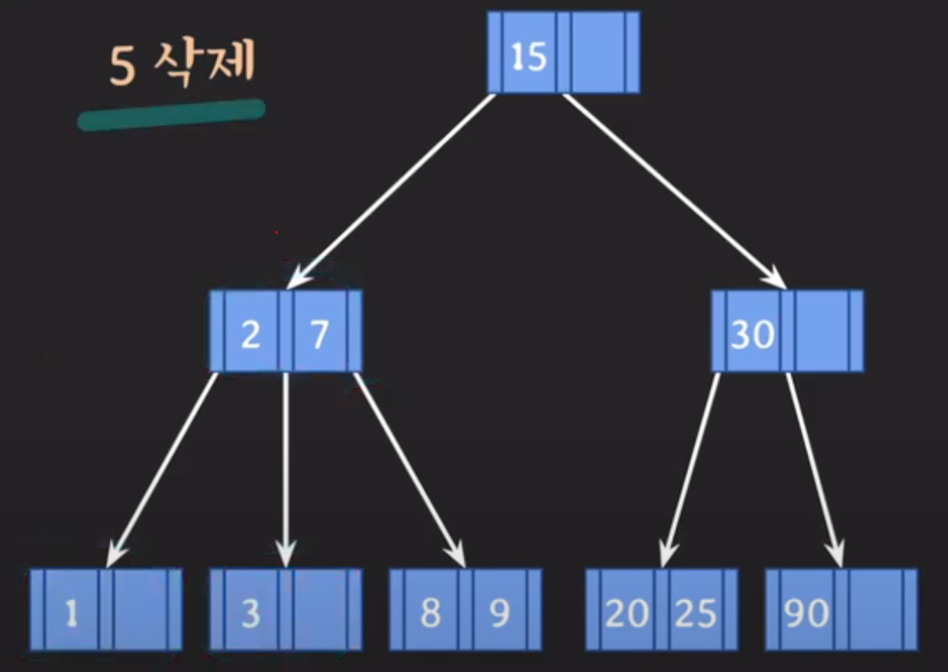 삭제를 하면 노드는 [5, ]가 된다. 각 노드의 최소 key 수는 1을 만족한다.