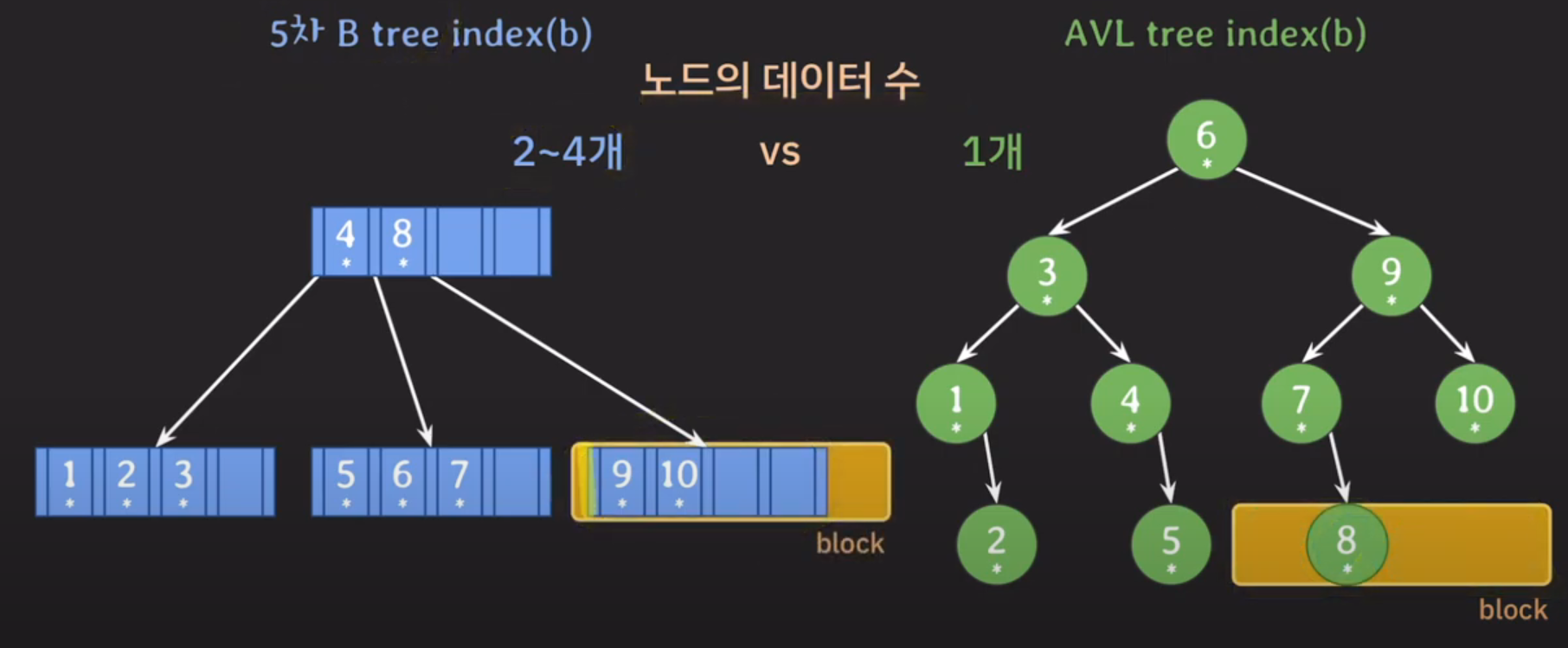 5차 B tree는 DB에서 사용할 데이터를 가져올 가능성이 AVL tree에 비해서 더 많다.