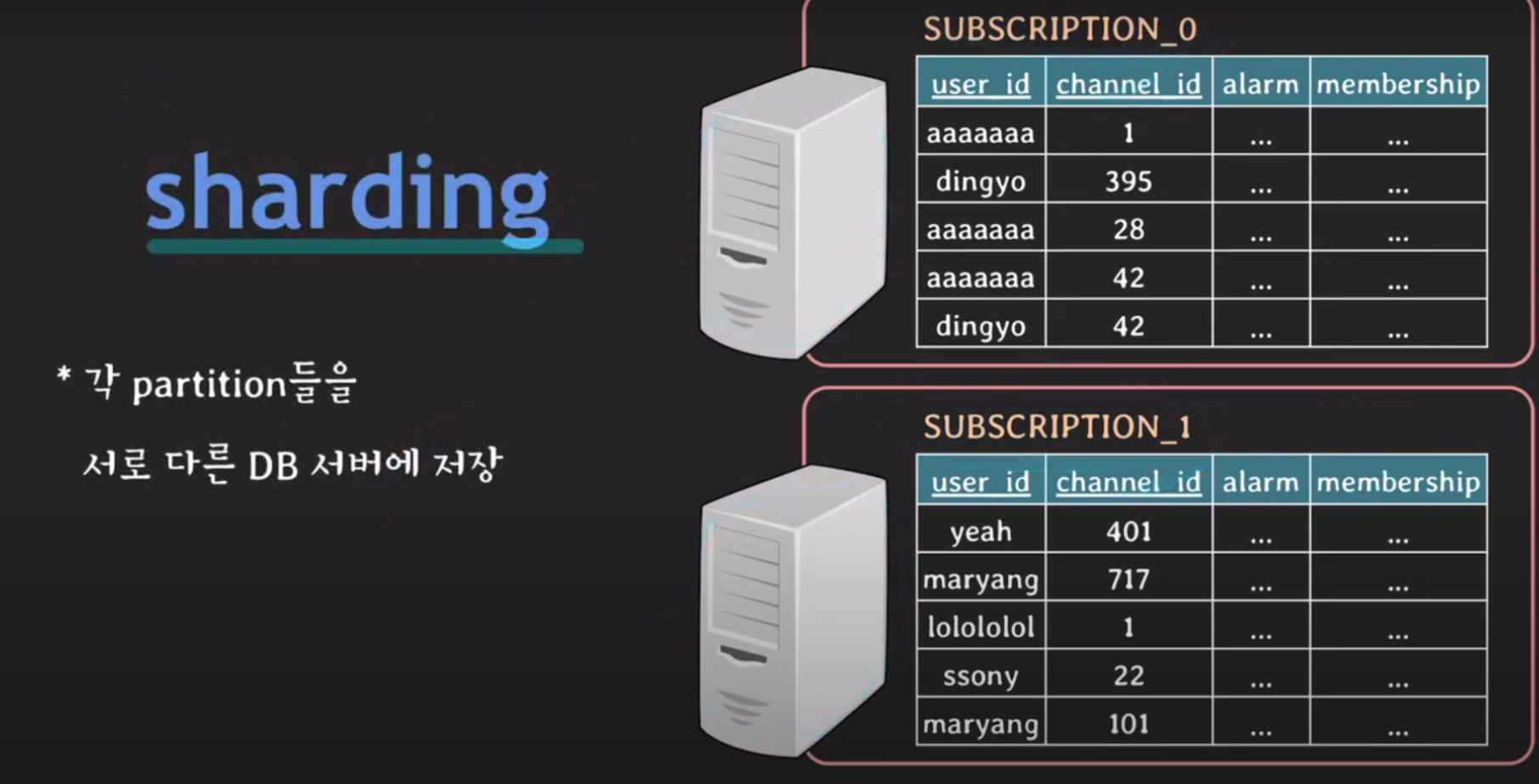 horizontal partitioning 방식으로 나누어진 table들을 각각의 DB 서버에 저장하는 방식