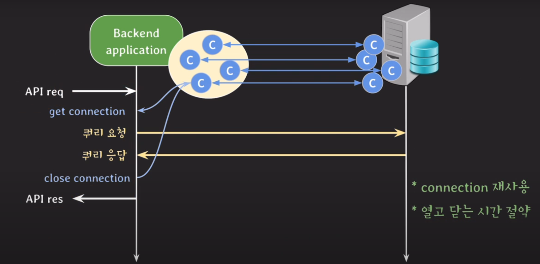 애플리케이션 서버(백엔드 서버)가 시작되면 미리 커넥션 풀에 DB 서버와의 커넥션을 미리 생성한다. (커넥션 개수는 설정에 따라 다르다)