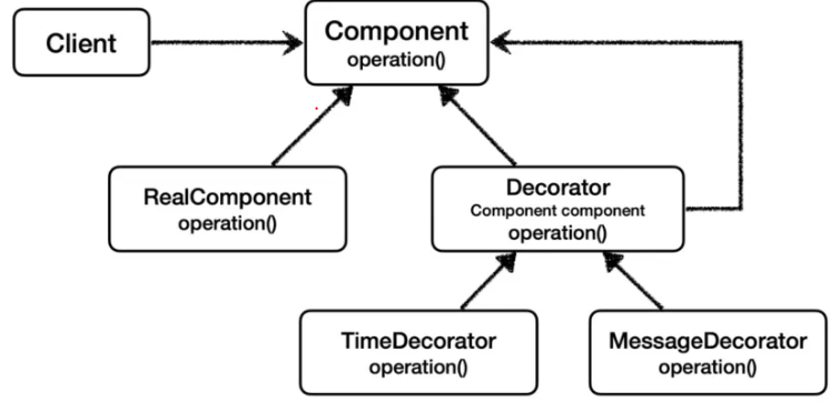 데코레이터 패턴에서 Decorator는 필드로 Targert(RealComponent / Decorator)를 가진다.